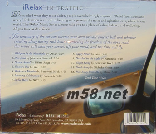 I Relax In Traffic 身心靈抒緩系到第五輯 新世紀(jì)純音樂(m58.net) Real Music唱片公司總部設(shè)在美國(guó)加利福尼亞,由生于倫敦的Terence Yallop在1985年創(chuàng)辦。擁有Karunesh、Kevin Kern等二十多位簽約藝人,發(fā)行七十多種專題系列唱片,在美國(guó)等四十多個(gè)國(guó)家的主流和另類樂壇均占有重要地位,它的出品是Billboard雜志的New Age排行榜上的常客,因此在過去的四年中被該雜志評(píng)為第二大New Age品牌。在當(dāng)今經(jīng)濟(jì)不斷發(fā)展的社會(huì),無論生活壓力還是工作壓力也都變得緊張起來,而放松減壓是關(guān)鍵。 高峰時(shí)段的擁堵,在汽車?yán)锬軌蚴婢從闵窠?jīng)的就是iRelax音樂系列,當(dāng)你聆聽由Real Music于2007年發(fā)行的《iRelax: In Traffic》這張由Real Music旗下樂手演奏的12曲柔和音樂作品,你會(huì)徹底放松和減輕來自世界各處的噪音煩惱! 這張《iRelax: In Traffic》是減壓專輯的第五張,iRelax是Real Music公司推出的精選輯系列,款款主題不同,這款《iRelax: In Traffic》中的12首曲目可以幫助你舒緩緊張的情緒,使你身心平衡、身體健康。