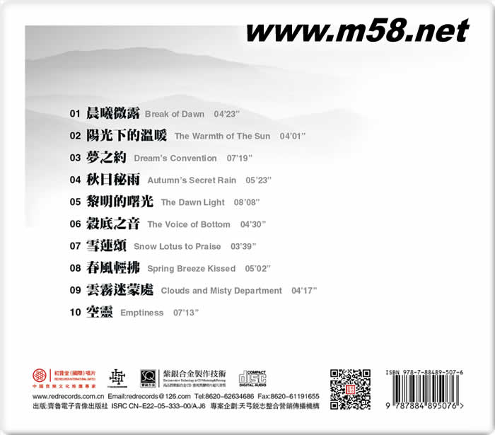 01 晨曦微露 Break of Dawn 04’23” 02 陽光下的溫暖 The Warmth of The Sun 04’01” 03 夢之約 Dream’s Convention 07’19” 04 秋日秘雨 Autumn’s Secret Rain 05’23” 05 黎明的曙光 The Dawn Light 08’08” 06 穀底之音 The Voice of Bottom 04’30” 07 雪蓮頌 Snow Lotus to Praise 03’39” 08 春風輕拂 Spring Breeze Kissed 05’02” 09 云霧迷蒙處 Clouds and Misty Department 04’17” 10 空靈 Emptiness 07’13”