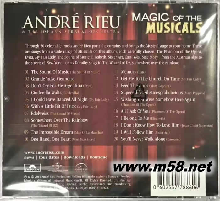 Magic Of The MUSICALS(m58.net) 20首歌舞劇經(jīng)典樂曲,特別收錄「貓」、「真善美」、「歌劇魅影」、「仙履奇緣」、綠野仙蹤」與「窈窕淑女」等歌舞劇名曲演繹。☉安德烈.瑞歐/約翰.史特勞斯管弦樂團 安德烈.瑞歐是位才華洋溢,將古典樂深入淺出的音樂家。他以史特勞斯圓舞曲為根本,並以各種多元型式將管弦樂的優(yōu)美結(jié)合流行、電影、舞臺劇與民謠等音樂型態(tài),提昇音樂欣賞的品味。同時他也是位優(yōu)秀的作曲家,在2014年最新錄音當(dāng)中,他自己也譜下一曲圓舞曲「Grande Valse Viennoise」,比美歌舞劇的扣人心弦場景。 這張收錄20首歌舞劇名曲的全新專輯「歌舞劇神采」,特別將最優(yōu)美的舞臺劇經(jīng)典旋律與膾炙人口的樂曲,詮釋演奏成輯。包括「真善美」、「仙履奇緣」、「綠野仙蹤」與「窈窕淑女」等,20首樂曲就像是眾多樂迷的浪漫年輕回憶。因為這些歌舞劇大多改編成電影,並獲得廣大樂迷與戲迷的共同記憶。當(dāng)然「歌劇魅影」與「貓」等劇也曾經(jīng)數(shù)度在臺灣巡演,無論是電影或是歌舞劇愛好者,對這些音樂都有一個美好時光的印象。 安德烈.瑞歐在自己的音樂安排中總呈現(xiàn)一種永恆不變的浪漫情懷,單純的音樂感動正是現(xiàn)代人欠缺的。希望藉著這些音樂,讓樂迷在生活當(dāng)中找回年輕純真的心靈。