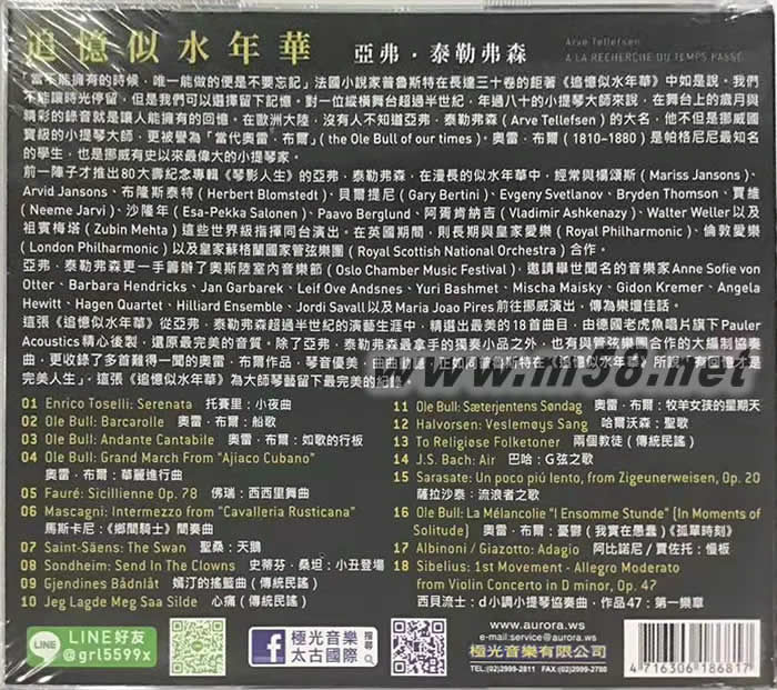 這張《追憶似水年華》從亞弗.泰勒弗森超過半世紀的演藝生涯中,精選出最美的18首曲目,由德國老虎魚唱片旗下Pauler Acoustics精心后制,還原最完美的音質。除了亞弗.泰勒弗森最拿手的獨奏小品之外,也有與管弦樂團合作的大編制協奏曲,更收錄了多首難得一聞的奧雷.布爾作品,琴音優美,曲曲動聽,正如同普魯斯特在《追憶似水年華》所說「有回憶才是完美人生」,這張《追憶似水年華》為大師琴藝留下最完美的紀錄。