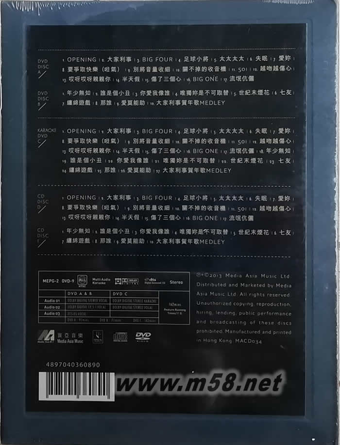 THE BIG FOUR 大家利事演唱會2013 (2 Live DVD + Karaoke DVD + 2 Live CD)(m58.net) Big Four歲晚徐夕夜將于紅館開騷,舉行《The Big Four大家利事世界巡迴演唱會2013》,張衞健、許志安、蘇永康和梁漢文與樂迷共度新春至年初五,特別為演唱會獻唱賀年新曲「大家利事」和medley!四子載歌載舞之馀,又在臺上不斷互嘲和惡搞,將最怕再見到的昔日造型重現舞臺(蘇永康扮演張衞健當年的孫悟空造型,梁漢文將當年康仔的臺灣夜店事件,張衛健扮安仔當年全裸拍寫真集的造型),笑翻全場!Big Four施展渾身解數演出,吊威飛飛翔又大演踢板,許志安更在以飛天鋼琴自彈自唱,梁漢文跳勁舞,張衛健棟篤笑兼變魔術。 《大家利事演唱會2013》首批以Live雙DVD+Bonus Live雙CD+卡拉OK DVD發行。