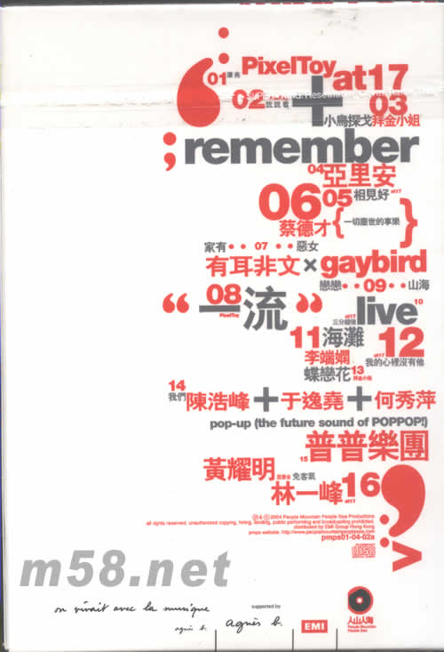 在很多樂迷的心目中,“人山人海”已經成了香港樂壇的一面旗幟,以黃耀明為核心的這個廠牌或者說音樂團隊多年來證明了他們能堅持自己的音樂理想,然后也不失商業上的市場。這張合集收錄的16首作品基本可以反映“人山人海”的音樂趣味,只是曲目偏多,混進了幾首濫竽充數。第一推薦曲是黃耀明去年專輯《我的廿一世紀》的原創版本《一切塵世的享樂》,蔡德才處理得清冷脫俗,哀而不傷,比明哥的版本更勝一籌。