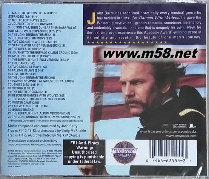 01. Main Title, Looks Like A Suicide (7:34) 02. Ride To Fort Hayes (2:02) 03. Journey To Fort Sedgewick, Shooting Star, John Dunbar Theme, Arrival At Fort Sedgewick (4:55) 04. The John Dunbar Theme (2:18) 05. The Death Of Timmons (2:25) 06. Two Socks, The Wolf Theme (1:31) 07. Stands With A Fist Remembers (2:11) 08. The Buffalo Robe (2:12) 09. Journey To The Buffalo Killing Ground (3:39) 10. Spotting The Herd (1:49) 11. The Buffalo Hunt (Film Version) (4:33) 12. Fire Dance (1:40) 13. Two Socks At Play (1:59) 14. Falling In Love (3:04) 15. Love Theme (3:46) 16. The John Dunbar Theme (2:06) 17. Pawnees, Pawnee Attack, Stone Calf Dies, Toughest Dies (6:15) 18. Victory (1:03) 19. The Death Of Cisco (2:14) 20. Rescue Of Dances With Wolves (2:09) 21. The Loss Of The Journal, The Return To Winter Camp (2:08) 22. Farewell, End Title (8:46) 23. The Buffalo Hunt (Album Version) (2:44) 24. The John Dunbar Theme (Film Version) (2:22)