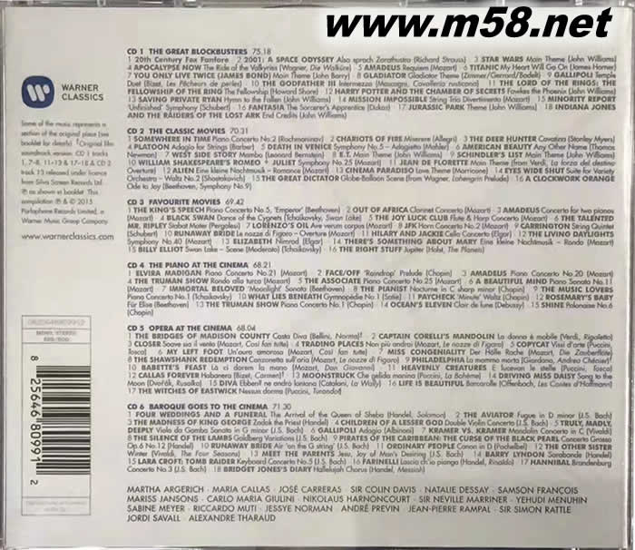 電影音樂百分百 BEST FILM CLASSICS 100 (6CD套裝)(m58.net) 在無聲電影時代,雖然技術上無法讓影像搭配任何聲音,但是業者還是以現場演出的方式,讓音樂能與影像結合在一起,只因為音樂是最能表現深刻情感與意境的藝術。到了有聲電影時代,電影配樂工業更是蓬勃發展了起來,許多古典音樂作曲家也開始譜寫電影配樂。時至今日,嚴肅音樂與電影配樂似乎已經成為兩門專長不同的藝術,但是古典音樂依舊經常在電影里出現。它們不但深刻表現出影像的氣氛與意境,同時也讓許多非古典音樂愛好者認識了這些作品,體會到古典音樂的美好。 甚至,有些較為罕見的古典音樂因為在某部賣座電影里出現而咸魚翻身,成為唱片錄音或是音樂會舞臺的寵兒。這一套唱片,收錄了一百首曾經在電影里出現過的古典名曲,或是因為太受歡迎而改編成管弦樂曲,繼續以另一種面貌活躍於音樂會舞臺或錄音室的電影配樂,演出者包括鋼琴家阿格麗希、女高音卡拉絲、男高音卡列拉斯、女高音德賽、鋼琴家富蘭梭瓦、指揮家朱里尼、鋼琴家薩洛,還有哈農庫特、曼紐因、慕提、朗帕爾、拉圖、雅洛斯基等人。