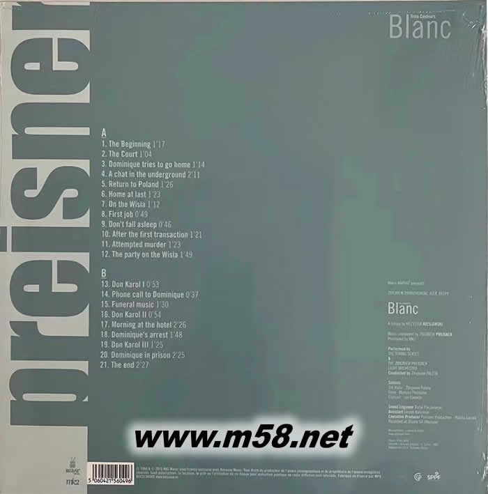 藍白紅三部曲 白 TROIS COULEURS BLANC Original Soundtrack Zbigniew Preisner 黑膠(m58.net) 第50屆威尼斯電影節最佳影片金獅獎,基斯洛夫斯基最經典電影的配樂,反復聽上幾個月也不會失望,以交響樂為主,聽來較為沉重,但普非沉悶,非常具有力度和張力。180克黑膠加CD