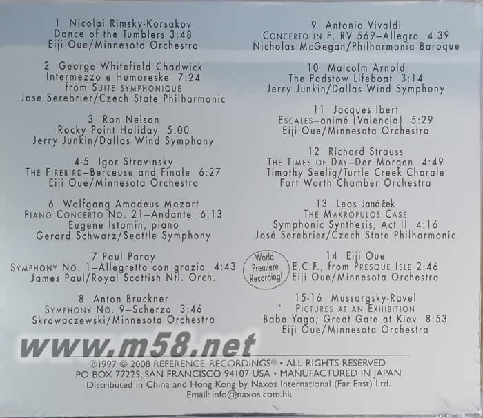 1.NICOLAI RIMKY-KORSAKOV DANCE OF THE TUMBLERS EILI OUE/MINNESOTA ORCHESTRA 2.GEORGE WHITEFIELD CHADWICK INTERMEZZO E HUMORESKE FROM SUITE SYMPHONIQUE JOSE SEREDRIER/CZECH STATE PHILHARMONIC 3.RON NELSON ROCKY POINT HOLIDAY JERRY JUNKIN /DALLAS WIND SYMPHONY 4-5.LGOR STRAVINSKY THE FIREBLRD-BERCEUSE AND FINDLE EILI OUE/MINNESOTA ORCHESTRA 6.WOLGANG AMADEUS MOZART PIANO CONCERTO NO.21-ANDANTE EUGEN LSTOMIN ,PIANO GERARD SCHWARZ/SEATTLE SYMPHONY 7.PAUL PARAY SYMPHONY NO.1-ALLEGRETTO CON GRAZIA JAMES PAUL/ROAL SCOTTISH NT1.ORCH 8.ANTON BRUCKNER SYMPHONY NO.9-SCHERZO SKROWACZEWSKI/MINNESOTA ORCHESTRA 9.ANTONI VEVALDI CONCERTO IN F,RV 569-ALLEGRO NICHOLAS MCGEGAN/PHILHARMONIA BAROQUE 10.MALCOLM ARNOLD THE PADSTOW LIFEBOAT JERRY JUNKIN /DALLAS WIND SYMPHONY 11.JACQUES LBERT ESCALES -ANIME (VALENCIA) EILI OUE/MINNESOTA ORCHESTRA 12.RICHARD STRAUSS THE TIMES OF DAY-DER MORGEN TIMOTHY SEELIG /TURTLE CREEK CHORALE FORT WORTH CHAMBER ORCHESTRA 13.LEOS JANACEK THE MAKROPULOS CASE SYMPHONIC SYNTHESIS,ACT II JOSE SEREBRIER/CZECH STATE PHILHARMONIC 14.EILI OUE E.C.F,FROM PRESQUE LSLE EILI OUE/MINNESOTA ORCHESTRA 15-16.MUSSORGSKY-RAVEL PICTURES AT AN EXHIBITION BABA YAGO;GREAT GATE OT KIEV EILI OUE/MINNESOTA ORCHESTRA 01.林姆斯基.高沙可夫:舞曲 3'48 02、查域克:諧謔間奏曲 7'24 03、尼爾遜:“樂(lè)奇” 假日 5'00 04-05、史達(dá)拉汶斯基:火鳥(niǎo)選段 6'27 06、莫扎特:第21鋼琴協(xié)奏曲一行板 6'13 07、柏利:第一交響曲 4'43 08、布魯克納:第九交響曲一諧謔曲 3'46 09、韋華第:F大調(diào)協(xié)奏曲 4'39 10、雅諾:柏斯杜之船 3'14 11、以柏特:艾斯基爾 5'29 12、史特勞斯:時(shí)間之曰 4'49 13、楊納杰克:交響選段 4'16 14、大植英次全球首演錄音 2'46 15-16、穆索斯基一拉威爾:圖書(shū)展覽會(huì)一基輔大門(mén) 8'53