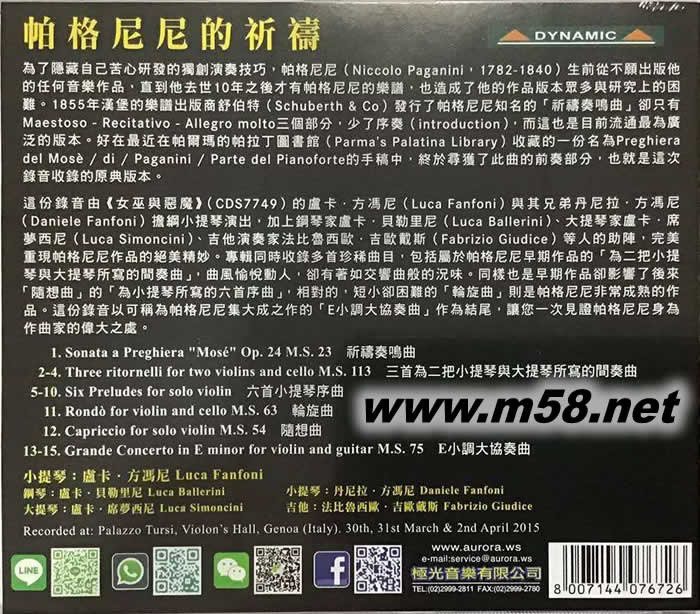 帕格尼尼 重新發現 Paganini Rediscovered(m58.net) Luca Fanfoni (violin)、Luca Ballerini (piano)、 Daniele Fanfoni (violin)、Luca Simoncini (cello)、 Fabrizio Giudice (guitar) 殿堂級音樂家帕格尼尼(Nicolo Paganini)出生自意大利的熱那亞(Genova),天賦他卓越的音樂才能,自小便得到父親的悉心栽培,結果不負所望,11歲便展開他的音樂生涯,於樂壇嶄露頭角,16歲創作出其絕世作品[24首隨想曲]而一鳴驚人,令他的事業大躍進,成為頂尖的作曲家。 國際知名的小提琴演奏家路卡.芬霍尼(Luca Fanfoni)肆業於"米蘭威爾第音樂學院(Giuseppe Verdi Conservatory in Milan)",師承吉捷諾.馬斯特里(Gigino Maestri),曾獲多個國際比賽獎項。芬霍尼在2015年4月於熱那亞(Genova)的多利亞宮小提琴廳(Palazzo Tursi, Violin’s Hall)內錄音,伙拍鋼琴家盧卡.巴萊里尼(Luca Ballerini)、小提琴家丹尼爾.芬霍尼(Daniele Fanfoni)、大提琴家盧卡·西蒙奇尼(Luca Simoncini)與及結他演奏家法布里奇奧.祖迪錫 (Fabrizio Giudice),帶來帕格尼尼以下的作品選: 世界首次以CD載體發行,包括給小提琴及鋼琴連同重新發現的序曲版本 1.羅西尼歌劇"摩西"主題變奏曲-摩西的祈禱,作品24,MS23(Sonata a Preghiera : Introduction and Variations on "Dal tuo stellato soglio" from Rossini's Mose in Egitto,Op.24,MS23)