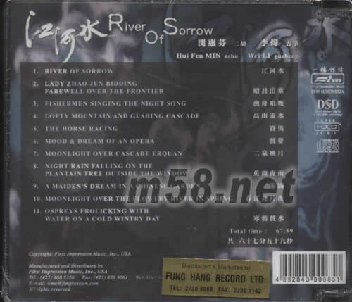 江河水HDCD(m58.net) 江河水 演出:閔惠芬/二胡 古箏/李煒 國樂一向對音響系統是一種考驗,音響系統聲音厚度不足者聽起來變成薄薄一片毫無悅耳可言,音響系統解析力夠但感情度詮釋能力不夠,那么聽起來也會變成呆板毫無生氣可言。本片可貴的是錄音非常優秀,演奏者的功力之深厚讓這些曲子有著更深一層的意境與感受,有一位很挑剔的發燒友,聽完本片說道:他從不聽國樂,從不知國樂也可以這么感人....云云。我個人認為喜歡國樂的樂友是值得您擁有的專輯,對發燒友來說,先估且不論本片的錄音效果,如果您是內行的音響發燒友,閔惠芬小姐錄完「江河水」之后,興高采烈的跑出錄音室向友人說道:我超越了自己了!也可以說是一張國樂的傳奇錄音已誕生了! 閔惠芬可以說是又再次突破她以往的成就,這一張專輯無論是錄音的成就或者是樂曲演奏的成就都可以說是國樂的典范,也是里程碑之一。這一張專輯的音樂性真可用FIM老板馬浚先生在本專輯內文的序言標題--繞梁十日可以形容。本片內文的中文解說之中,對本片的錄音以及樂曲解說、演奏者均有非常詳盡的說明,在此也不必再做文抄公了,請樂友們購買以后自行觀看。