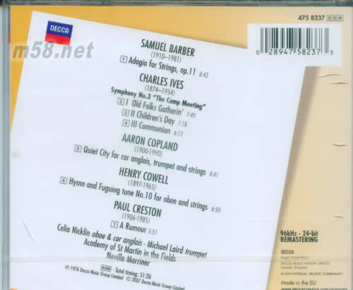 Album Works Summary Barber, Samuel : Adagio for Strings, Op. 11 Ives, Charles : Symphony no 3 "The Camp Meeting" Copland, Aaron : Quiet City Cowell, Henry : Hymn and Fuguing Tune no 10 for Oboe and Strings Creston, Paul : A Rumor