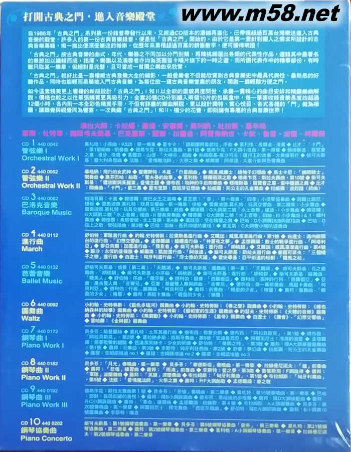 古典之門 II Gate to Classics I I (10CD套裝)(m58.net) 自1986年「古典之門」系列第一份錄音帶發行以來,又經過CD版本的濃縮再進化,已帶領超過百萬臺灣樂迷進入古典音樂的殿堂。許多人的第一份古典音樂錄音,便是從「古典之門」開始的。由於它是第一套針對國人之需求所設計的古典音樂專輯,甫一推出便深受樂迷的推崇。從歷年來累積超過百萬的銷售數字,便可獲得明證! 「古典之門」按古典音樂的曲式、年代、樂器之不同加以分門別類,再精挑細選出各類的代表性作品,選錄其中最著名的章節加以編輯而成,指揮、樂團以及演奏者亦均為英國笛卡唱片旗下的一時之選。而所謂代表作中的精華部份,有時雖只取某一樂章,但絕對是完整,且可當成一首獨立樂曲來欣賞。 「古典之門」就好比是一套權威古典音樂大全的縮影,一般愛樂者不但能欣賞到古典音樂史中最具代表性、最熟悉的好聽作品,同時也能輕而易舉地入門古典音樂,為每位欲一窺古典音樂堂奧的朋友,開啟一扇輕鬆方便之門。 如今這套精美更上層樓的新版設計「古典之門」I和II以全新的面貌再度問世,承襲一貫精心的曲目安排和精闢樂曲解說,價格也較之以往單張購買更具吸引力。全套20張CD分別編入兩個10片的包裝盒中,每一單套收錄音樂長度均超過12個小時,各內附一本全彩色精美手冊,不但有詳盡的樂曲解說,更以設計獨特、賞心悅目、各式各樣的「門」做為插圖,讓聽覺與視覺同為饗宴。一次典藏「古典之門」I和II,極少的花費,即刻擁有專屬的古典音樂世界!