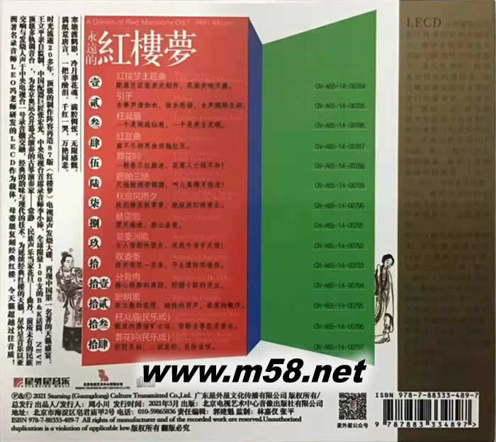 永遠的紅樓夢(87版)電視原聲碟 LECD 限量版(m58.net) 至今為止,87版的電視劇《紅樓夢》仍是無法超越的經典之作。時光流逝20多年,頂級的制作陣容再造87版《紅樓夢》電視原聲發燒大碟,再現中國第一名著的天籟盛宴。 由王麗萍親自監制,中國配器巨匠張宏光,中央電視臺首席錄音師李小沛,為北京奧運會開幕式演奏的古箏演奏家常靜,民族聲樂當家花旦曲丹強強聯手。此外,更有全球限量100支的B&K話筒、NEVE頂級多軌調音臺以及前所未有的民族交響與發燒人聲于中央電視臺一號錄音棚交融,經典的韻味與現代的技術結合呈現。