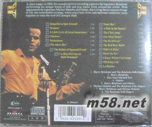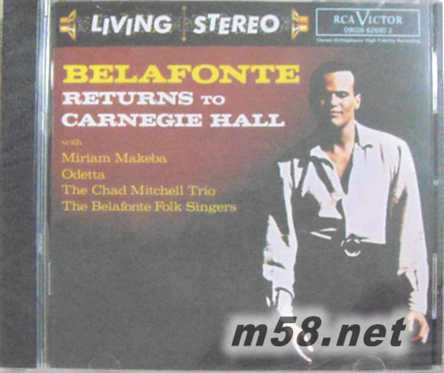 RETURNS TO CARNEGIE HALL 回到卡內(nèi)基演唱會 2(m58.net) 1959年,貝拉方特(Harry Belafonte)首次在卡內(nèi)基音樂廳舉辦了一場令人感動的個人演唱會。短短一年后,他再次登上卡內(nèi)基音樂廳的舞臺。與上次演繹嚴肅的民歌曲目形成強烈的對照,這次的演出更加新奇和詼諧。貝拉方特更像個音樂制作人,他邀請了Odetta、Makeba和Chad Mitchell 三重唱組同臺演出。當然,音樂會的開始和壓軸節(jié)目還是貝拉方特本人精彩奉獻的。 哈里?貝拉方特(Harry Belafonte)人稱“卡利普索歌曲之王”,其演唱吸收了民謠、爵士和世界打擊節(jié)奏音樂的精髓,在主流音樂方面取得了非常大的成功。《重返卡內(nèi)基音樂廳》于1960年5月2日錄制于卡內(nèi)基大廳,收錄18首經(jīng)典作品,是膾炙人口的發(fā)燒錄音,非常值得一聽。