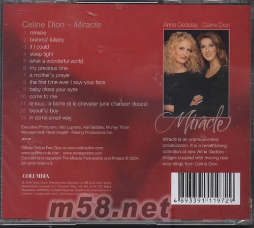 2004年10月國際流行樂壇天后席琳迪翁(CELINE DION)將要推出她的又一張最新專輯《愛的奇跡(MIRACLE)》。這張專輯不同于以往任何一張專輯,將是CELINE DION和國際著名的嬰兒攝影家ANNE GEDDES共同合作的產(chǎn)物,用溫暖的音樂和深情的攝影共同來表現(xiàn)母愛的偉大和嬰兒的可愛。CELINE DION目前已經(jīng)成為了孩子的母親,并非常愛自己的孩子,對于這張專輯她融入了許多生活當(dāng)中與孩子之間的真情實(shí)感,并用自己的歌聲聲情并茂地表達(dá)了這份情感。CELINE DION和ANNE GEDDES都認(rèn)為每一個(gè)來到這個(gè)世界上的新生命都是一個(gè)奇跡,而這個(gè)奇跡的根源來自于我們內(nèi)心的真情。