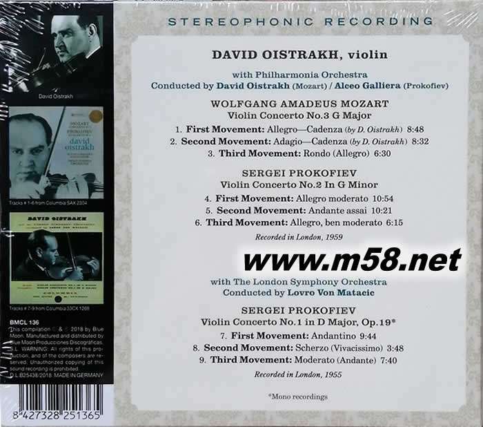 WOLFGANG AMADEUS MOZART: Violin concerto No.3 G Major 01. First Movement: Allegro – Cadenza 02. Second Movement: Adagio – Cadenza 03. Third Movement: Rondo (Allegro) SERGEI PROKOFIEV: Violin Concerto No.2 in G Minor 04. First Movement: Allegro moderato 05. Second Movement: Andante assai 06. Third Movement: Allegro, ben moderato SERGEI PROKOFIEV: Violin Concerto No.1 in D Major, Op.19* 07. First Movement: Andantino 08. Second Movement: Scherzo (Vivacissimo) 09. Third Movement: Moderato (Andante) *Mono recording