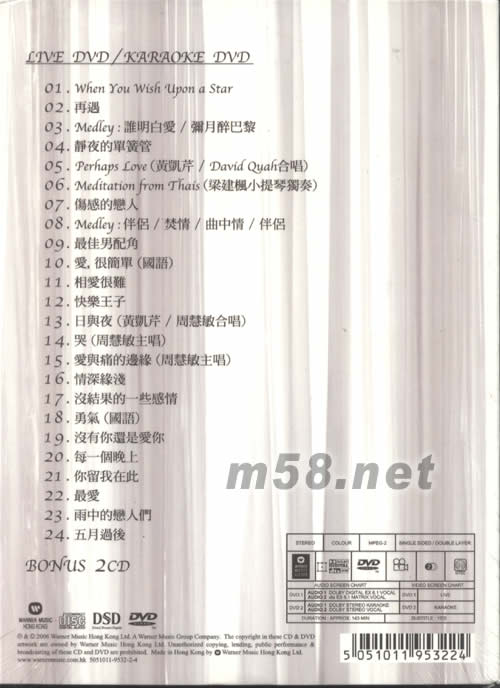 一夜情弦演唱會(huì)卡拉OK DVD(m58.net) DTS DOLBY MPEG-2 DVD 1 DTS ES 6.1 LIVE DVD 2 DOLBY STEREO VOCAL KARAOKE 143分鐘 超凡演繹多首經(jīng)典傷口及中外浪漫歌曲: 雨中的戀人們 傷感的戀人 再遇 誰(shuí)明白愛(ài) 伴侶 焚情 曲中情 WHEN YOU WISH UPON A STAR 特別嘉賓周慧敏及DAVID QUAH演繹 日與夜 哭 愛(ài)與痛的邊緣 PERHAPS LOVE