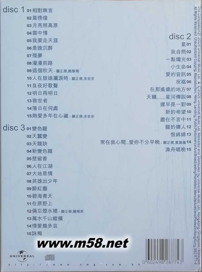 Disc 1 01. 相對(duì)無(wú)言 02. 莫徬徨 03. 月亮照高原 04. 雪中情 05. 我要走天涯 06. 是誰(shuí)沉醉 07. 殘夢(mèng) 08. 漫漫前路 09. 這個(gè)秋天 (關(guān)正杰,鮑慧珊) 10. 人在旅途灑淚時(shí) (關(guān)正杰,余安安) 11. 良夜好歌聲 12. 明日再明日 13. 救世者 14. 落日在何處 15. 熱愛(ài)多年在心藏 (關(guān)正杰,余安安) Disc 2 01. 星 02. 我自問(wèn) 03. 一點(diǎn)燭光 04. 小生命 05. 愛(ài)的音訊 06. 祝福 07. 在那遙遠(yuǎn)的地方 08. 天籟……星河傳說(shuō) 09. 遲早是一對(duì) 10. 新的希望 11. 盡在不言中 12. 龍的傳人 13. 恨綿綿 14. 常在我心間…愛(ài)你不分早晚 (關(guān)正杰,黃露儀) 15. 漁舟唱晚 Disc 3 01. 變色龍 02. 天蠶變 03. 天龍?jiān)E 04. 新變色龍 05. 楚留香 06. 人在江湖 07. 大地恩情 08. 英雄出少年 09. 醉紅塵 10. 碧海青天 11. 在原野上 12. 倆忘煙水裡 (關(guān)正杰,關(guān)菊英) 13. 萬(wàn)水千山縱橫 14. 情愛(ài)幾多哀 15. 詠梅