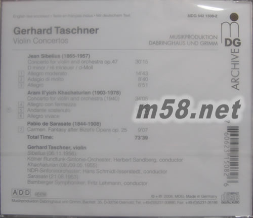 西貝流士與哈察者量小提琴曲,卡門幻想曲(m58.net) 深受指揮大師福特萬格勒賞識的天才小提琴家塔斯欽納生前留下的錄音並不多,德國 MDG 唱片特別從各地現場演出的珍貴檔案中將他的錄音挖掘出來,讓樂迷得以聽聞到他的杰出琴藝。這張專輯中的三首曲目分別是 1956 年、1955 年與 1953 年的三場音樂會的實況錄音。芬蘭最偉大的作曲家西貝流士於 1903 年完成的「小提琴協奏曲」,是他告別十九世紀「浪漫主義」,迎向二十世紀「新古典主義」的巨作,在塔斯欽納的詮釋下,音符有如秋風掃落葉般輕盈自在的與伴奏樂團相互應答,呈現出雍容華貴的氣度,將曲作中熱情與冷靜兩種不同面向透過音樂完美的融合在一起。同樣的,哈察都量的「小提琴協奏曲」也是一首充滿旋律性的作品,作曲家將這首曲子題獻給二十世紀最偉大的俄國小提琴家大衛‧歐伊斯特拉夫(David Oistrakh),曲中洋溢著濃濃的亞美尼亞風格,慢板樂章流露出一股的悲壯氣息,充滿沉溺的美感與濃烈的情感。透過塔斯欽納精確又溫暖的演繹,更將曲中獨特的異國風味完全釋放。而由小提琴大師薩拉沙泰改編自比才歌劇「卡門」的「卡門幻想曲」更是一首充滿炫技風格的作品,在這份錄音中更可充分體會到塔斯欽納出神入化的小提琴技藝。