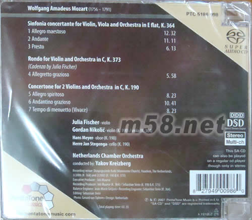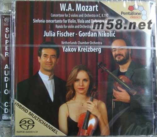 1. Sinfonia concertante for violin, viola & orchestra in E flat major, K. 364 (K. 320d) Wolfgang Amadeus Mozart Gordan Nikolic (viola), Julia Fischer (violin), Netherlands Chamber Orchestra, Yakov Kreizberg (conductor) 2. Rondo for violin & orchestra in C major, K. 373 Wolfgang Amadeus Mozart Julia Fischer (violin), Netherlands Chamber Orchestra, Yakov Kreizberg (conductor) 3. Concertone for 2 violins, oboe, cello & orchestra in C major, K. 190 (K. 186E) Wolfgang Amadeus Mozart Gordan Nikolic (violin), Julia Fischer (violin), Herre-Jan Stegenga (cello), Hans Meyer (oboe), Netherlands Chamber Orchestra, Yakov Kreizberg (conductor)