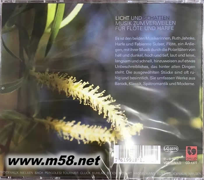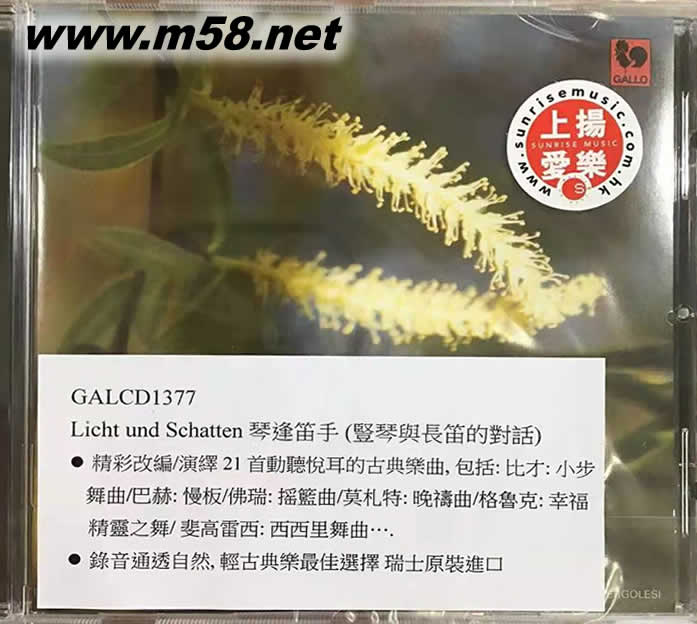 琴逢笛手 Licht und Schatten (豎琴與長(zhǎng)笛的對(duì)話)(m58.net) 精彩改編/演繹21首動(dòng)聽悅耳的古典樂曲,包括: 比才: 小步舞曲/巴赫: 慢板/佛瑞: 搖籃曲/莫札特: 晚禱曲/格魯克: 幸福精靈之舞/ 斐高雷西: 西西里舞曲…. 錄音通透自然, 輕古典樂最佳選擇 瑞士原裝進(jìn)口