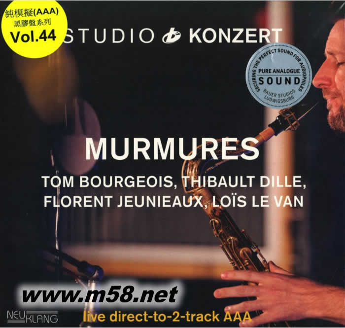 純模擬制作 Studio Konzert:湯姆‧布爾喬瓦、蒂博‧蒂爾、弗洛朗 朱尼奧斯及Studio Koncert (AAA Series) : Tom Bourgeois, Thibault Dille,Florent eunieaux & Loïs Le Van: Murmures 黑膠(m58.net) Tom Bourgeois (薩克斯管及低音單簧管) Thibault Dille (手風(fēng)琴) Florent Jeunieaux (結(jié)他) Loïs Le Van (主唱) 最接近原音的純模擬製作—Studio Konzert黑膠系列 由現(xiàn)場(chǎng)錄音,直接入兩軌模擬錄音臺(tái)(Direct-To-2-Track) 至母盤制作整個(gè)過程全是模擬制作(AAA),全球限量發(fā)行1000套編號(hào)版