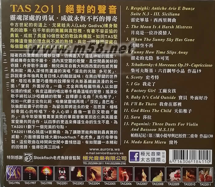 TAS 絕對的聲音CD 2011(m58.net) 中古世紀的街道上,戈黛娃夫人(Lady Godiva)裸身騎馬的故事,在千年前的美麗與哀愁里,有著不容妥協的勇氣,成就了長達10個世紀的歌詠與傳說,如同TAS堅持傳達音樂的理念與不滅的熱情。與您一同發掘深藏在每個靈魂里,無與倫比的聲音。 隨著西西里舞曲的曼妙旋律,彷彿進入了遙遠神秘的國度,挪威傳奇女歌手羅卡.透內芙空靈的歌聲,是世間最美好的奇蹟;丹麥歌手漢娜.鮑兒與來自義大利西西里的性感男聲馬利歐,兩人深情而瀟灑的演唱「溜走的光陰 多可笑」,訴說著多年后再見昔日情人的酸甜滋味;在黑白琴鍵的世界里,塔拉布果靈巧優雅的詮釋柴可夫斯基纖細浪漫的另一面;「寶貝 外面好冷」一曲,尤金與瑪格麗特兩人以如膠似漆的情感,俏皮逗趣的唱出寒冬里最溫暖的愛戀;搖滾女歌手綺拉以沙啞纏綿的歌聲,詮釋爵士名曲「天佑稚子」,宛如一代爵士女伶比莉.哈樂黛靈魂再現;「莎拉」是巴布.狄倫獻給妻子的歌曲,為留住即將逝去的愛,在芭菠.楊格刻骨銘心的吟唱下,令人心碎;最后一首日文歌曲「窗外」,由今年榮獲雙葛萊美獎的華裔音樂家田志仁與英國皇家愛樂共同合作,以四季的更迭來傳達生命的生生不息,為TAS2011劃下一個完美的句點。 TAS2011精心挑選14首樂曲,為了讓聽眾能夠聽到最真實的感動,力邀德國發燒大廠Stockfisch「老虎魚」進行母帶后製。這些歌曲在時間與空間中盡情悠游,有如閱讀一本精彩的回憶錄,值得您再三回味。