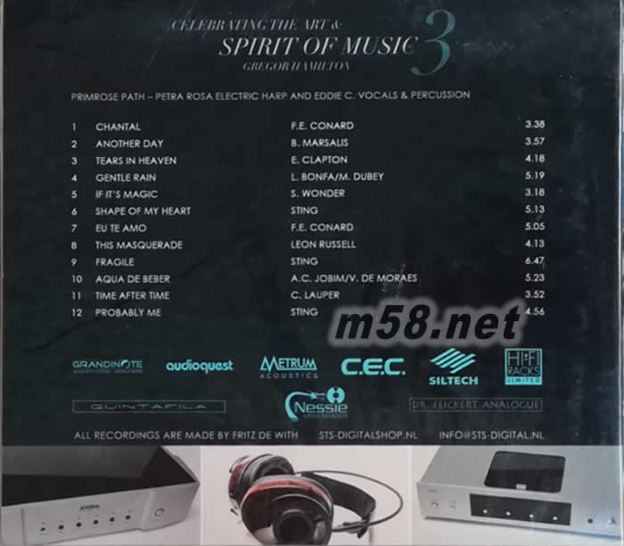 PRIMROSE PATH CELEBRATING THE ART & SPIRIT OF MUSIC 3 純正人聲(m58.net) STS Digitial 重新製作發(fā)行,兩位天才橫溢,早已在歐洲紅透半邊天,重新翻唱十二首經(jīng)典流行曲,是不折不扣的發(fā)燒級(jí)錄音,人聲跟樂器質(zhì)感充實(shí),細(xì)碎聲尾弱音齊全,定位好到出奇,喜好發(fā)燒軟件人仕萬勿錯(cuò)過!