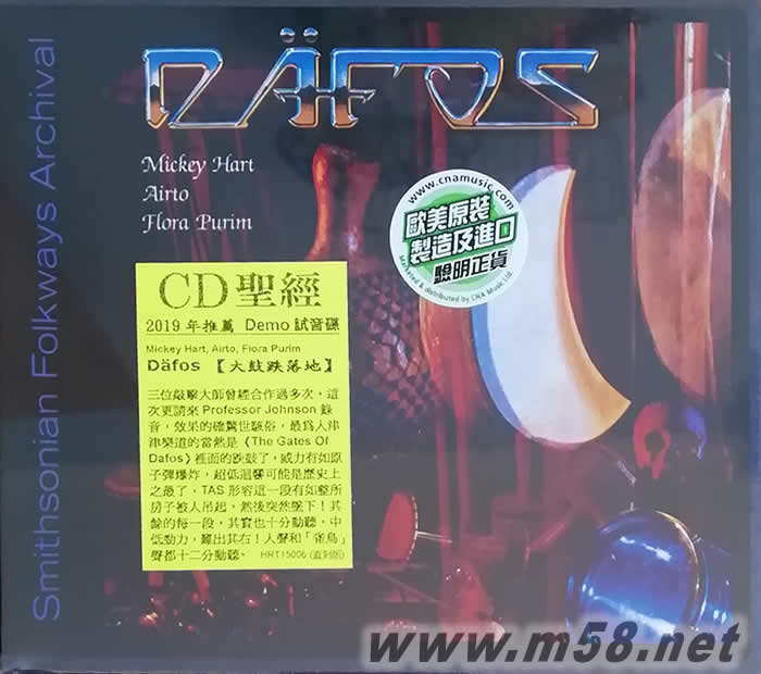 Mickey Hart Dafos大鼓跌落地 2019推介DEMO試音碟 直刻版(m58.net) TAS上榜專輯Dafos (大鼓跌落地) 發行30週年,直刻紀念版。 發燒友推崇備至之Dafos (大鼓跌落地),這張TAS上榜作品,在三藩市現場錄製,當年為敲擊樂音樂會慶祝活動之表演。歌曲The Gate Of Dafos 最為人津津樂道。裡面的跌鼓,TAS形容這一段有如整所房子被人吊高,然後突然墜下,但由於錄音電平較低,請各位小心調校音量。 直刻版 paper sleeve case