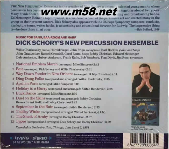 敲擊之王 Music for Bang Baa Room and Harp 立體聲名盤(TAS專業推介發燒名盤)(m58.net) Dick Schory – Music for Bang, Baa-Room and Harp (敲擊之王) TAS上榜名盤,更是最佳流行作品十大之一,與Casino Royale、Belafonte at Carnegie Hall、Dark side of the Moon等等齊名。Dick Schory被稱謂敲擊之王,實至名歸、當之無愧。他首先是一個敲擊樂手,后與芝加哥交響樂團合作,他做爵士樂,更懂得敲打流行音樂和實驗音樂。當然古典與流行敲擊樂演奏上的影響力,更是他對世界最大之貢獻。在20世紀50至60年代,他做了10多張作品,他的音樂一直潛藏在許多敲擊樂手內心,影響深遠。在1958年,他製作了震撼全球專輯Music for Bang, Baa-Room And Harp (敲擊之王),論演繹和錄音效果,空氣感豐滿的敲擊之王,活靈活現,讓人一聽再聽,百聽不厭。精準無誤之定位,舞臺型態大小,無遮無掩。不僅前后左右立體分明,各種樂器逼真;盡現眼前,一覽無遺。強勁音效地動山搖,所向披靡,弱音更是纖毫畢現,表現人前;是品嚐或試機的不二之選。