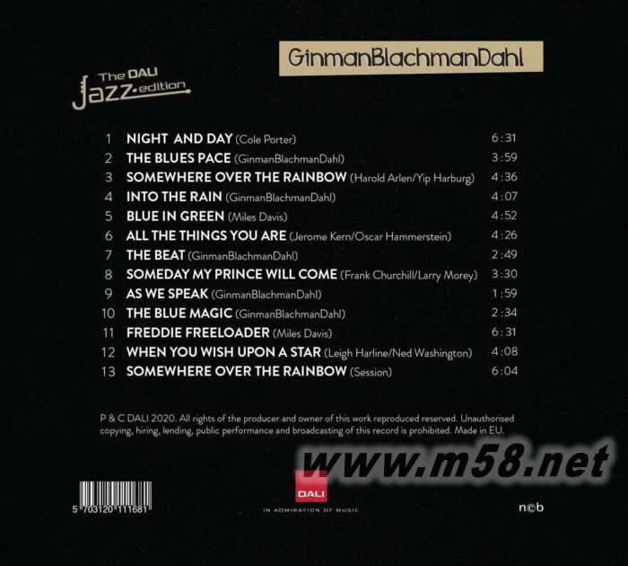 達尼 6 測試天碟 THE DALI CD VOL.6 THE VELVET BLUES (丹麥著名發燒品牌三十五周年))(m58.net) GinmanBlachmanDahl是丹麥斯堪地那維亞(Scandinavia)爵士樂壇上的杰出Jazz Trio,由丹麥音樂界的三個重要和主要人物組成,包括:Lennart Ginmann,Thomas Blachman和Carsten Dahl。他們三人在爵士世界都舉足輕重,當時更驚動到Verve Records要簽約為他們發行,使他們成為第一支Verve Records丹麥樂隊。“The Velvet Blues”是他們的第三張專輯,也是他們與丹麥著名喇叭品牌DALI的首次合作。 從緊密有節奏有律動的拍子,到抽象而解放的自由結構就是根植於經典,迷人的傳統爵士樂誕生的音樂。而三位演奏者受到相當大的歡迎,因為這就是久違的音樂嘗試 在錄音方面,Dali的CEO Lars先生花費了大量的時間,力求錄音所呈現的極高品質。丹麥總部的Inez女士說道,現如今,全球剩下為數不多的世界性共通點,而“音樂”就是其中之一。作為一家擁有35年專業生產,研發,製造音箱的丹麥公司,他們知道什么叫“好的聲音”,所以,我們愿意花費更多的精力,更多的資源去錄製每款Dali 的黑膠和CD作品,以此致敬音樂,以此致敬Dali三十五周年的發展,以此致敬好的聲音。
