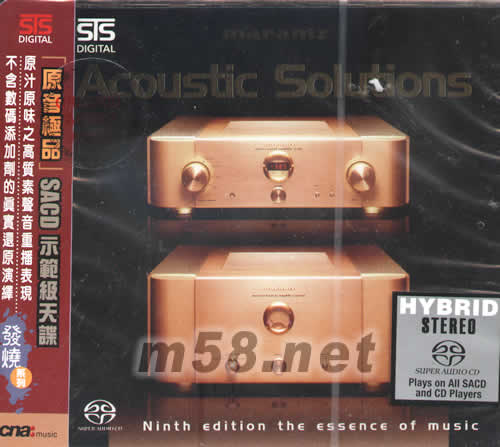 價格為估,以實到貨為準! [原音極品]SACD 示范級天碟ACOUSTIC SOLUTIONS(m58.net) 原汗原味之高質素聲音重播表現 不含數碼添加劑的真實還原演繹 Marantz-Model 7 & Model 9的傳奇 就因為音樂這一份熱情推動了Marantz在過去五十年期間,為了達成對音樂上的確定:因而我們承諾在每一次音樂重播當中,都能帶給您無比清晰及真實效果。或許在每一次重播過程中,感覺猶如身處現場一樣,都能帶給您真實而難忘的聆聽經驗,就為了能呈現完美高質素音樂播放的這份執著與承諾,從而推動我們制作一系列舉世聞名的器材記載在音響歷史里;我們承繼最優秀技術,驅使我們最偉大設計及工程師精制一系列令人為之震懾的音響產品。簡單的說,我們祈望的音響或家庭影音組合能帶給我們的是:聆聽空間感,那種大能量而純厚及獨特的高質素重播演繹,完全表達出音樂里那種活生生的情感點滴,我們當然不能忘記我們最經典的音響器材-Marantz Model 7及Model 9于音響業界輝煌成就超過四十多年,這兩款不能分割的完美音響組合融合了傳統理性構思和美學設計理念,不單能奠定Marantz名字及商標品牌在業界之崇高地位,亦同時影響了音響界在各種器材進化過程中的領導方向。直至今天,Model 7 & 9保持在業界中堅守著傳統類比聲(Analogue)年代,雖然我們仍然努力不懈制作不同的音響器材及組合能帶給愛樂者多方面選擇,但他們的重生并不是代表響往過去的緣故,而在于那一份自豪及光榮感;Model 7 & 9仍然堅守原有的制作理念和不斷發展于現在或未來器材組件上所許下的高質素承諾,盡管我們面對在音樂根源或錄音模式上已經不斷改變的事實,但慎重及嚴謹的設計工程師繼續不斷接受在音樂和音響歷史轉變上的不同挑戰;最令人感到振奮的就是能將這兩款舉世聞名的音響名器在音響歷史上變得更為充實和更具代表性。要再欣賞Model 7 & 9所散發出的獨特而秀麗聲效,在今天已經可以說不容易的事,但在Super Audio CD(SACD)重播格式面世正構成了今天的SC-7S1及MA-9S1的全新型號誕生,它們不但繼承了Model 7 & 9優良設計及獨特秀麗的重播演繹,也是今天SACD軟件上的絕佳配對機種。即使在現今高科技年代,為何我們仍舊任命Model 7 & 9標記著這些新產品,就因為當您聆聽過后便能分辨及領略出其明顯而與眾不同的獨特音色。在不斷追求完美的音樂重播要求下,Marantz讓一切終極科技夢想都變為真實,這就是Because Music Matters。 專輯內容: STS Digital為尋求更出眾的聲效重播感覺,達至黑膠唱片那種溫暖潤澤效果和全無粗糙及硬而無味的數碼重播音色-Acoustic Solutions[原音極品]的構想理念因此而生。本專輯在荷蘭Wisseloord Studio作現場錄制;雖然這所Studio提供了極度完善的錄音配備,但STS Digital錄音師不惜工本用上自攜230條絕源電纜作為錄音器材之用,為求穩定正常電壓之供應,因此每次都需要關上鄰近所有照明系統,才能接上所有錄音器材。聆聽本碟能帶給你前所未有之現場感,那全無半點數碼味添加劑的重播效果,真實的樂器外貌及那所95平方米Wisseloord Studio的現場空間感覺,猶如毫不費力般展現出來。多首重新演繹之名曲:Don t know why、Moanin、Because mucho、The nearness of you、Misty、What a difference a day makers及Alice in Wonderland等等均換上全新風格的爵士(Jazz)霓裳羽衣,亮麗而更富吸引力;原汁原味、原音極品。