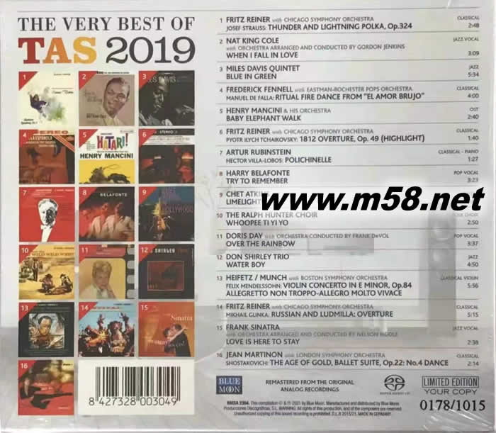 絕對(duì)之聲 The Very Best of TAS 2019 16首精選 SACD限量版(m58.net) 西班牙藍(lán)月亮Blue Moon 2019年重點(diǎn)推薦,全力打做,精心挑選16張真正TAS上榜天碟,抽選當(dāng)中最佳歌曲,由模擬母帶制作,德國印碟。藍(lán)月亮旗下爆棚精選,加上最強(qiáng)之制作人,最先進(jìn)設(shè)備,把重播音效更推上一層,帶出無可比擬之發(fā)燒音效,2019年示范級(jí)完美天碟!