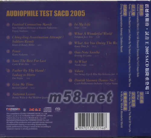 價(jià)格為估,以實(shí)到貨為準(zhǔn)! 試音王2005 SACD(m58.net) 全城贊譽(yù),無(wú)比震憾! 震撼與期待,試音王2005SACD版隆重出場(chǎng) 試動(dòng)態(tài) Festival Coronation March/Dco"rak Slivouic Dances No.7 in C major Kolo 試人聲 FEVER/Save hte Best for Last /Father By Thy Hand/Lendsag os Herre/Give Me Time 試瞬變 Ching-ling Assaination Attenpt /Soldiers Revolt 試低頻 SO What 試空氣感 What Are You Doing The Rest of your life 音樂(lè)感表達(dá) In My Life/What A Wonderful World