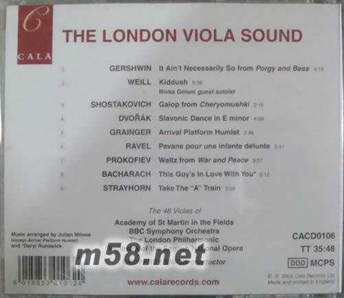 倫敦48把中提琴THE LONDON VIOLA SOUND(m58.net) 關(guān)于「?jìng)惗刂鬞he London Sound」: CALA唱片公司推出的「?jìng)惗刂粝盗小梗且詳?shù)十支單一種類(lèi)樂(lè)器的合奏,包括小提琴、中提琴、大提琴、低音提琴、拉丁大提琴、小喇叭、法國(guó)號(hào)以及伸縮號(hào)等,參與演出者則來(lái)自倫敦最重要與最具代表性的各大樂(lè)團(tuán),合力完成一系列膾炙人口的大眾名曲。這不但是錄音史上的創(chuàng)舉,其超乎想像優(yōu)異的錄音效果,更是器樂(lè)合奏的最佳典范。自1993年發(fā)行第一集「?jìng)惗卮筇崆僦簟挂詠?lái),此系列一直受到好評(píng),更是銷(xiāo)售排行榜上的常勝軍。 ★音色飽滿而寬敞,音樂(lè)輕松愉悅。 ……收藏者一定會(huì)想播放其中示范級(jí)的錄音曲目,尤其是蕭士塔高維契的嘉洛普舞曲。推薦! --Gramophone雜志 關(guān)于本輯: 本輯系集合圣馬丁、BBC交響、倫敦愛(ài)樂(lè)以及英國(guó)國(guó)立歌劇院等樂(lè)團(tuán)的四十八位中提琴演奏家,共同完成的世紀(jì)之作!將樂(lè)團(tuán)當(dāng)中最神秘、音色最暗、音量最小的弦樂(lè)器--中提琴齊聚一堂,在此它們不但遠(yuǎn)離在樂(lè)團(tuán)中始終擔(dān)任內(nèi)聲部的次要角色,進(jìn)一步當(dāng)家作主,展現(xiàn)前所未有的驚異之旅。它們毫無(wú)顧忌的盡情揮灑,展現(xiàn)出中提琴內(nèi)斂、灰暗的特色,甚至讓人感受到中提琴吟唱的本領(lǐng),以及銳利的激情表現(xiàn)。精采的合奏與超級(jí)的錄音,愛(ài)樂(lè)者當(dāng)然不應(yīng)錯(cuò)過(guò)。