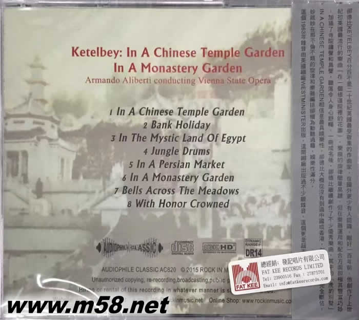 上世紀初英國暢銷作曲家卻德比KETELBEY .百萬銷路作品齊集 .超天版級錄音 全球首度發行CD ,卻德比KETELBEY百分百不是二十世紀英國最受敬重的作曲家,在國外更少有人認識,剛好一百年前,他創作了上世紀初英國最流行的樂曲(在一個修道院里的花園),樂曲的旋律簡單易聽,但在樂器運用和配合方面卻極其豐富巧妙,加插了寺院鐘聲和鳥聲,聽落令人身心舒暢,一曲成名后,卻德比繼續創作了不少優秀樂曲,其中的虎豹別墅 IN A CHINESE TEMPLE GARDEN相信是最具娛樂性,卻德比大概從沒有到中國或香港,創作這首樂曲完全斷估,妙就妙在那不倫不類的旋律和樂器編排卻極為動聽過癮,娛樂性滿分這個1963年錄音由美國細廠WESTMINISTER出版,這間細廠出版過不少靚錄音,這個更少超天碟級數