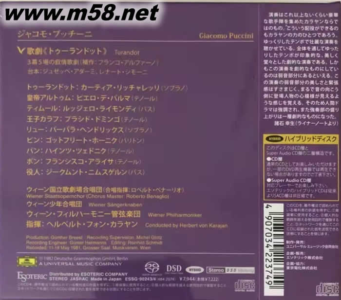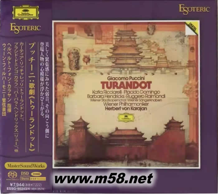 Giacomo Puccini : Turandot 普契尼 : 圖蘭朵 (SACD限量版)(m58.net) Genre: Opera Katia Ricciarelli (Turandot) Piero De Palma (Altoum) Ruggero Raimondi (Timur) Plácido Domingo (Calif) Barbara Hendricks (Liu) Conducted by Herbert von Karajan 指揮:卡拉揚 Wiener Staatsopernchor Chorus Master: Roberto Benaglio Wiener Sängerknaben Wiener Philharmoniker 指揮:卡拉揚 ( Herbert von Karajan ) 樂團:維也納交響樂團 (Wiener Philharmoniker ) ESOTERIC專屬代理權 ■ 產品序號:ESSG-90243/44 ( 2片裝 ) ■ 格式:SACD/CD 混合式光碟片 ■ 商標:Deutsche Grammphon ■ DSD信號處理格式/SACD層音效:立體聲 ■ 豪華精裝版包裝 <普契尼:圖蘭朵全劇>卡拉揚指揮維也納愛樂樂團 2SACD。這張唱片眾星云集,聚集了哈恰萊莉、多明戈和亨德里克斯在內的強大陣容,并由維也納愛樂樂團伴奏,潛心研究、反復推敲,最終錄制成這款迄今為止最具中國情調的《圖蘭多特》。企鵝三星名盤。
