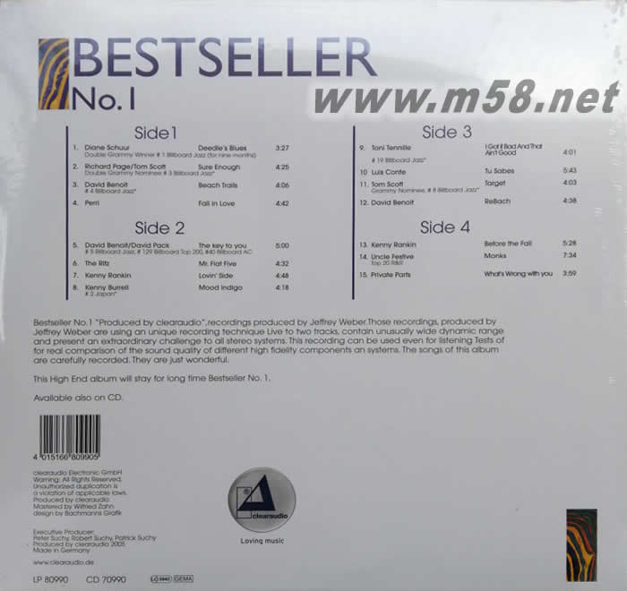專攻模擬大盤的德國高級音響品牌Clearaudio,廿多年來致力炮製不同格價範疇的黑膠唱盤,並同時為各國同業提供OEM模組。除了唱盤生產線外,廠方還自資開拓錄製發燒軟件的專科分部,本文介紹「Bestseller No1」實屬多年來一直被發燒友評為娛樂性極高的必買軟件,全碟共有15首極具代表性的爵士樂佳作,包括失明女天后Diane Schuur 「Deedle's Blues」、Kenny Rankin「Lovin' Side」及Tom Scott「Target」等等。有關製作細節,手頭上的「Bestseller No 1」黑膠大碟運用雜質含量極低,成本非常高昂180克處女膠壓製,並以孖碟方式在歐洲進行生產,好讓音效水平跟同門出品的唱盤一樣,具備無可匹敵的卓越質素。