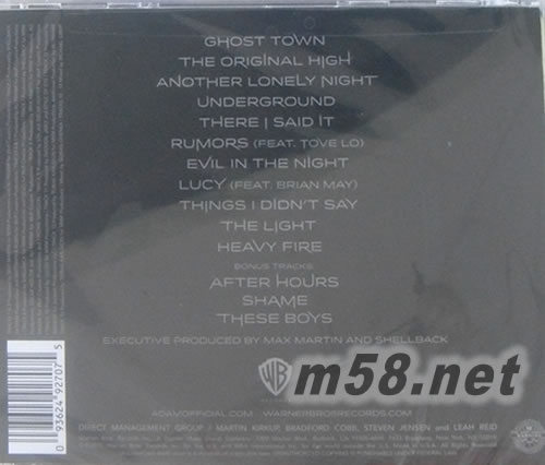 1. GHOST TOWN鬼城 西部牛仔的口哨、吉他悅耳撥弦,與90年代House舞風(fēng)串連,引發(fā)各國(guó)排行騷動(dòng)的首支單曲 2. THE ORIGINAL HIGH 原始快感 3. ANOTHER LONELY NIGHT 又一個(gè)孤寂的夜 以Synthpop線條貫穿,點(diǎn)燃夜晚的光鮮亮麗,不怕孤獨(dú)來(lái)襲 4. UNDERGROUND 地底下 5. THERE I SAID IT 說(shuō)出口了 6. RUMORS (FEAT. TOVE LO) 流言(與 托芙蘿 火熱對(duì)唱) 與瑞典神奇女王-托芙蘿一起互飆歌喉,碰撞出獨(dú)特的迷幻魔力 7. EVIL IN THE NIGHT 夜里的邪惡 8. LUCY (FEAT. BRIAN MAY) 露西 邀來(lái)皇后樂團(tuán)的傳奇吉他大師Brian May助陣,秀出搖滾吉他野性飆奏 9. THINGS I DIDN’T SAY 我沒說(shuō)出的話 10. THE LIGHT 光芒 11. HEAVY FIRE 猛烈的火 BONUS TRACKS: 12. AFTER HOURS 下班后 13. SHAME 羞恥 14. THESE BOYS 這些男孩