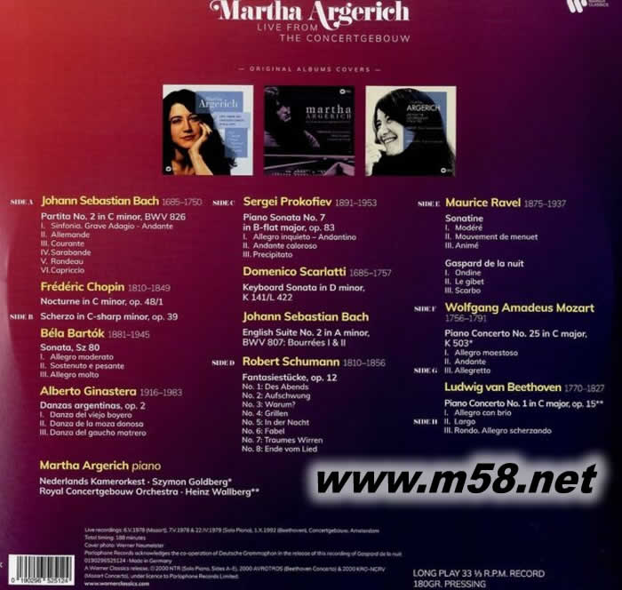 SIDE A 巴哈:C小調(diào)第二號組曲,BWV 826 蕭邦:C小調(diào)第十三號夜曲,作品48-1 SIDE B 蕭邦:升C小調(diào)第三號詼諧曲,作品39 巴爾托克:鋼琴奏鳴曲,Sz.80 希納斯特拉:阿根廷舞曲,作品2 SIDE C 普羅高菲夫:降B大調(diào)第七號鋼琴奏鳴曲,作品83 史卡拉第:D小調(diào)鋼琴奏鳴曲,K. 141 巴哈:布雷舞曲(A小調(diào)第二號英國組曲,BWV 807) 《鋼琴小品集-1978/79阿姆斯特丹皇家大會堂現(xiàn)場錄音》 SIDE D 舒曼:幻想小品,作品12 SIDE E 拉威爾:小奏鳴曲 拉威爾:夜的加斯巴 SIDE F & SIDE G & SIDE H 莫札特:C大調(diào)第二十五號鋼琴協(xié)奏曲,K. 503 戈德堡〈指揮〉荷蘭室內(nèi)樂團(tuán) 貝多芬:C大調(diào)第一號鋼琴協(xié)奏曲,作品15 沃爾堡〈指揮〉皇家大會堂管絃樂團(tuán)