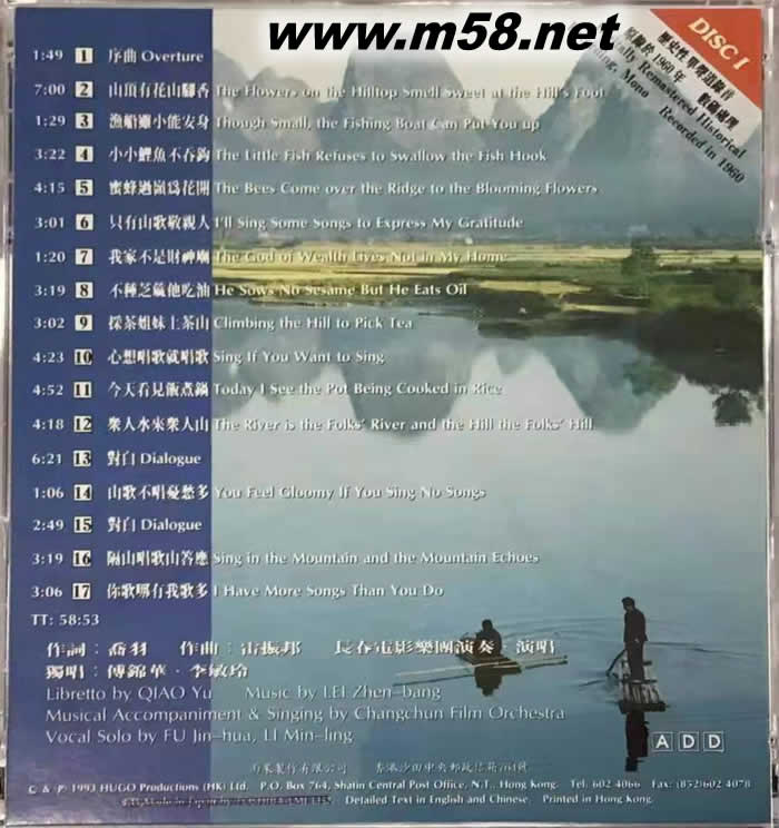 劉三姐電影原聲(上集) 港版(m58.net) 劉三姐幾首是中國(guó)民歌的代名詞,多少年來,劉三姐的歌聲婦孺皆知,傳唱不衰。細(xì)品起來,真是好歌天成——這些信口采頡的詞曲,資源豐富得很,實(shí)在信手拈來——似是水里的魚、山上的茶,一抓一把。好象不用經(jīng)過大腦,從心里從口里直接淌出來般自然。桂林山水甲天下,劉三姐的歌是山水之魂了。