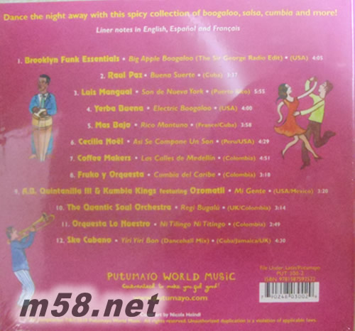 拉丁派對 Latin Party(m58.net) 拉丁美洲最夯、最時尚、最熱情的跳舞歌大全 紐約夜店的Boogaloo、哥倫比亞的Cumbia,到加勒比海的古巴的Son、牙買加的Reggae/SKA、波多黎各的Salsa 拉丁音樂堪稱世界最熱情有活力的音樂之一,拉丁音樂的曲式都直接與舞蹈及舞步相關,不論是為了歡樂派對所需,或是真的要用來跳舞,亦或是只是單純的用來打造享受休閒渡假的氣氛,拉丁音樂絕對是大家共同的首選。拉丁音樂之所以如此受歡迎,全賴各種熱力十足又富含變化的曲式,源自美國紐約夜店的Boogaloo、哥倫比亞的Cumbia,到加勒比海的古巴的Son、牙買加的Reggae/SKA、多明尼加的Bachata及Merengue、波多黎各的Salsa,甚至到南美巴西的Samba及Bossa Nova,整個一路串連下來,並向世界幅射延燒,全球完全陷入拉丁音樂的歡樂氣氛之中。 世界音樂大廠Putumayo推廣拉丁美洲音樂一直不遺於力,先后推出了多張的主題選輯,包括蒐羅時尚電子拉丁新藝人曲式的Nuevo Lation、齊聚諸多當今拉丁人氣好手的Radio Latino、拉丁舞會專用的¡Baila!、展現拉丁美洲女聲魅力的Women of Latin America,全都是叫好叫座的暢銷作,此輯Latin Party又是在全球期盼下推出的Party系列新作,收錄了上列讓人瘋狂的拉丁曲式,包括由紐約兩大拉丁樂隊Brooklyn Funk Essentials及Yerba Buena共獻的兩首當前時尚紐約夜店最夯的Boogaloo舞曲;兩組先后旅居法國的古巴組合Raul Paz及Mas Bajo帶來兩首不同風味的Son/Cha Cha Cha歌曲;由兩個波多黎各組合Luis Mangual及Cecilia Noël演出的標準Salsa曲風,也讓人熱到無法喘息;另哥倫比亞團體Coffee Makers大膽採用了牙買加的SKA;另一支哥倫比亞團體Fruko y Orquesta則展現出最有當地特色的Cumbia樂風,這些拼湊起來,就是一幅熱情難擋的拉丁派對。