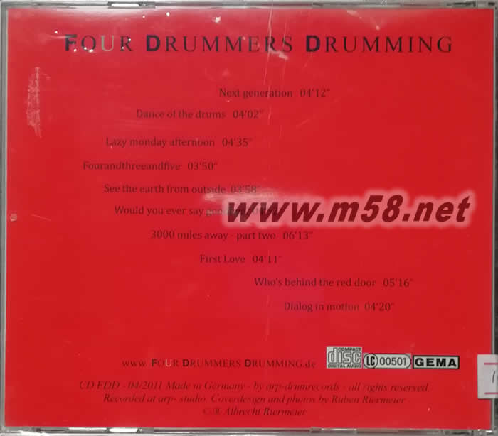 四鼓齊嗚 之 烽煙4起FOUR DRUMMERS DRUMMING NO. 4(m58.net) 烽煙4起是鼓怪Albrecht Riermeier (阿爾布雷希特) 最新作品,在2010至2011年度錄音。首次大膽地在自己作品中加入女聲,使用拍打樂器數十種,更動用多支名器作拾音,包括: Neumann KM84, TLM 103, U 87 及Sennheiser 421等等。阿爾布雷希特要帶出每件拍打樂器之個性和音響表現,不只是收錄其原有音色,要發揮其泛聲和音調之美感,他對每件拍打樂器都非常了解,他可以錄製出清晰的定位,每件拍打樂器各安其位,真誠合作,各展所長,絕不含糊;實是烽煙4起時、萬物號哭,一切導因於【四鼓齊嗚】。