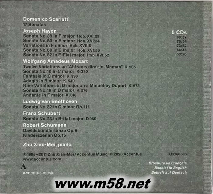 朱曉玫在古典音樂界占有重要地位,尤其是她對巴赫音樂的寶貴詮釋。這套CD專輯收錄了斯卡拉蒂、海頓和莫扎特以及貝多芬、舒伯特和舒曼為鋼琴家創作的重要作品。這些錄音證明了她通過獨特的藝術眼光和對音調的敏感度來表達各種風格和時代的能力。它們錄制于 1995 年至 2011 年之間,這些已經絕版多年的專輯,首次重新以6位作曲家5CD套裝發行,樂迷不容錯過。