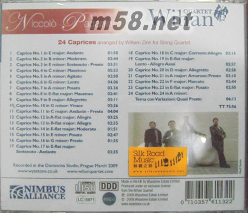 帕格尼尼:二十四首奇想曲 (弦樂四重奏版)[Paganini: 24 Caprices arranged for String Quartet(m58.net) 本輯是由著名的編曲兼作曲家威廉‧金(William Zinn),將帕格尼尼的二十四首奇想曲改編成弦樂四重奏演奏版本。若以帕格尼尼為展現自身技巧,而以獨奏小提琴來創作此曲的初衷來看,這個改編似乎顯得有些畫蛇添足。但仔細聆聽,在威廉‧金的妙筆之下,他以發掘重於改編的精神,更清楚呈現出隱藏在作品中的和聲與對位。於是您所聽到的就不只是單一小提琴的炫技演奏,而是由四位演奏者所呈現的「完整」音樂。在不違背原作內涵之下,威廉‧金改變音域,加進和聲與對位,並公平賦予每樣樂器演奏空間,更在最著名的第二十四號奇想曲中寫進幾小節的前奏。而最重要的是,他進一步揭示了帕格尼尼這組作品在音樂史上承先啟后的脈絡。例如當以弦樂四重奏來演奏第三號奇想曲時,所呈現的內容似乎和貝多芬的后期弦樂四重奏相去不遠。又如第十八號奇想曲的主部,和海頓作品又有幾分神似。愛樂者在這個錄音里可以感受到,在原曲精神之下有著新語法的奇想曲。 1985年成立於捷克的威漢弦樂四重奏團,除了以演奏祖國作曲家史麥塔納、德弗札克作品著稱外,在古典、浪漫時期,以及近代的荀白克、費茲納等四重奏領域,亦有相當高的評價。尤其是2007-2008年在布拉格的現場貝多芬弦樂四重奏全集錄音(已由Nimbus發行),更令人刮目相看。在本輯中,他們以精湛的合奏和一支小提琴的內張力與緊湊感相抗衡,豐富的色彩在優異的錄音下,更充份展現弦樂四重奏的音響厚度。