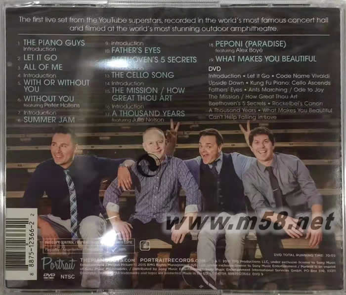 DVD Live! DVD / Video track listing: 1. The Piano Guys Introduction 2. Let It Go 3. Code Name Vivaldi 4. Upside Down 5. Kung Fu Piano: Cello Ascends 6. Fathers' Eyes 7. Ants Marching / Ode To Joy 8. The Mission / How Great Thou Art 9. Beethoven's 5 Secrets 10. Rockelbel's Canon 11. A Thousand Years 12. What Makes You Beautiful 13. Can't Help Falling In Love