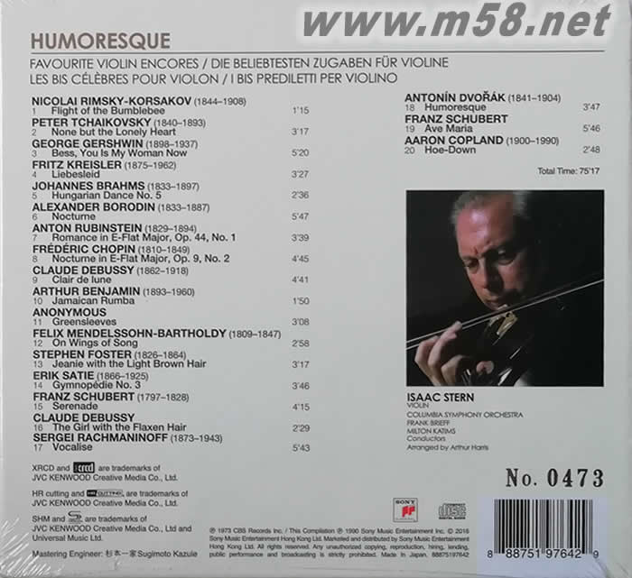 小提琴大師 Humoresque NEW XRCD 限量版(m58.net) 精心挑選4款經典作品 全部日本原裝進口JVC原厰壓碟! 樂迷必要收藏! 2001年9月22日,素有小提琴教父之稱的艾薩克.史坦(Isaac Stern),因心臟衰竭在紐約康乃爾醫學中心過世,享年81歲。這位曾經拯救卡內基音樂廳免於被拆除命運的大師,一生對於提拔后進不遺余力,是大提琴家馬友友、王健,小提琴家帕爾曼與祖克曼等人的恩師。冷戰期間,他也曾率先嚐試破冰之旅,遂而享有「美國音樂大使」之稱。 1979年,中國大陸剛結束歷時十年的文化大革命,史坦受當時受中國外交部及美國駐中國大使邀請,出訪中國大陸,此舉使他成為第一位文化大革命后進入中國的西方音樂家。