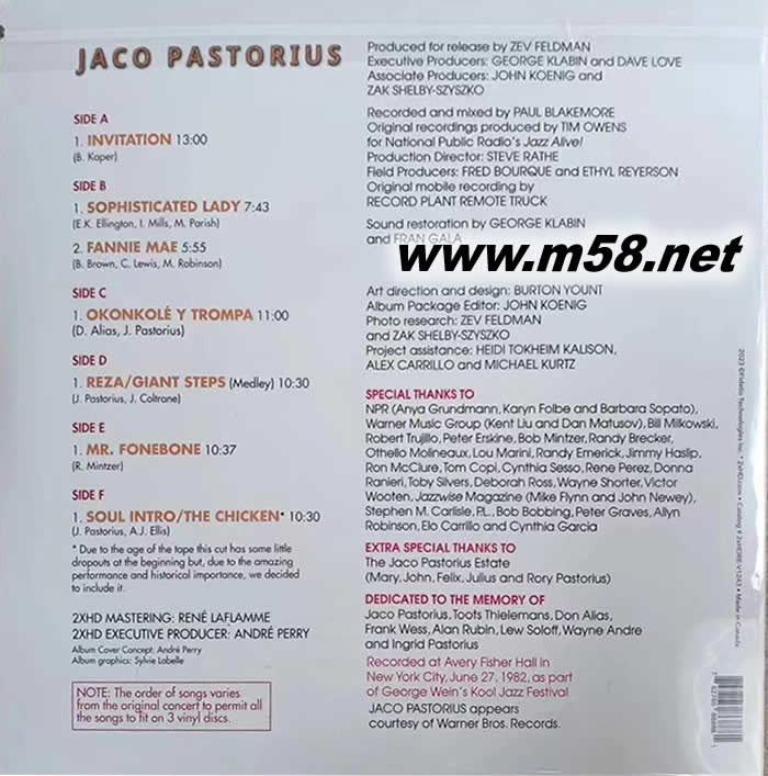 aco Pastorius以35歲之齡逝世,《Down Beat》雜志選入爵士名人堂,被公認(rèn)是史上最具革命性、影響力的低音結(jié)他手。Jaco 在1982 離開 Weather Report后,組成 Word of Mouth Big Band 后首張現(xiàn)場作品。紐約林肯中心(Lincoln Center) 費雪音樂廳 (Avery Fisher Hall) 現(xiàn)場130 分鐘之非凡突破性音樂,比利時爵士及口琴演奏家托茲席爾曼(Toots Thielemans)作為特邀嘉賓,1982年6月27日,以24軌模擬方式錄制。加拿大2xHD使用Nagra銘器,利用原始第一代類比母帶,全模擬AAA 100%制作,以45 RPM進(jìn)行剪輯。