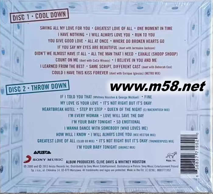 [DISC 1.COOL DOWN戀戀情深篇] 01. YOU GIVE GOOD LOVE 85年全美節奏單曲榜冠軍,流行單曲榜冠軍,抒情榜第4名![榮獲全美音樂獎最受歡迎節奏藍調單曲 02. SAVING ALL MY LOVE FOR YOU 85年首支征服英美流行單曲榜節奏藍調單曲榜三冠王單曲!葛萊美獎最佳流行女歌手獎作品 03. GREATEST LOVE OF ALL 86橫跨全美流行單曲榜3周與抒情榜5周雙料冠軍!歌頌世間溫暖真愛感人肺腑情歌! 04. ALL AT ONCE 與85年首支征服英美流行單曲榜與節奏藍調單典榜三冠王單曲“SAVING ALL MY LOVE FOR YOU”同時發行之雙單曲 05. IF YOU SAY MY EYES ARE BEAUTIFUL(duet with Jermaine Jackson) 全球首度暴光!86年與麥可杰克森之史杰美雙眸含情凄美對唱之單曲 06. DIDN T WE ALMOST HAVE IT ALL 87年全美流行單曲榜雙周冠軍、抒情榜3周冠軍、節奏藍調 單典榜亞軍!一首憶景情傷的美麗小品。 07. WHERE DO BROKEN HEARTS GO 全美流行單曲榜雙周冠軍、抒情榜3周冠軍、節奏藍調單典榜亞軍!撫慰傷心人的最佳戀歌。 08. ALL THE MAN THAT I NEED 90年全美流行單曲榜雙周冠軍、抒情榜4周、節奏藍調 單曲榜雙周三軍王金曲!薩克斯風巨星肯尼吉深情相伴! 09. RUN TO YOU [終極保彪]電影主題曲之一!大衛佛斯特制作全美抒情榜第10名 10. I HAVE NOTHING 全美點播榜6周冠軍、抒情榜雙周冠軍,、英國單典金榜季軍、全美流行、節奏藍調單曲榜第4名!榮獲奧斯卡最佳電影主題曲提名[終極保彪]主題曲之一! 11. I WILL ALWAYS LOVE YOU 全球驚創3400萬張銷售天量之[終極保彪]電影原聲帶主題歌!全美14周冠軍、全英10周冠軍、全美抒情榜5周冠軍、節奏藍調單典榜11周冠軍!葛萊美獎最佳專輯單曲女歌手3項大將得獎世作! 12. EXHALE(SHOOP SHOOP) 95年締創史上第一首發行首周空降全美流行流行單曲榜冠軍后座的單曲!電影[等待夢醒時分]主題曲 13. WHY DOES IT HURT SO BAD 感人全球無敵情侶之至深抒情金曲 14. I BELIEVE IN YOU AND ME 97年全美抒情榜亞軍、流行單曲榜與節奏藍調單曲榜名列第8、電影[天使保彪]主題曲 15. HEARTBREAK HOTEL(featuring Faith Evans & Kelly Price) 99年全美舞曲榜冠軍、流行單曲榜與節奏藍調榜連霸7周冠軍!傷心人最戀的節拍 16. MY LOVE IS YOUR LOVE 2000年全美舞曲榜冠軍、節奏藍調單曲榜亞軍、英國單曲金榜亞軍、全美流行單曲榜第4名!FUGEES難民營合唱團首腦WYCLEF JEAN掌舵雷鬼民國搖擺風情中版舞曲 17. SAME SCRIPT,DIFFERENT CAST(duet with Deborah Cox ) 2000年全新單曲!惠妮與美聲新天后黛博拉扣克絲競飚歌唱實力淋漓之作 18. COULD I HAVE THIS KISS FOREVER 2000年全新單曲!獨家收藏特別混音版!惠妮與拉丁巨星安立奎聯手征服抒情海之年度對唱終極之作! (duet with Enrique Iglesias)(METRO MIX) [DISC 2.THROW DOWN驚世動感篇] 01. FINE 02. IF I TOLD YOU THAT (Whitney Houston & George Michael) 03. IT S NOT RIGHT BUT IT S OKAY(thunderpuss mix) 04. MY LOVE IS YOUR LOVE (JONATHAN PETERS MIX) 05. HEARTBREAK HOTEL (featuring Faith Evans & Kelly Price)(HEX HECTOR MIX) 06. I LEARNED FROM THE BEST(HQ2 MIX) 07. STEP BY STEP (JUNIOR VASQUEZ MIX) 08. I M EVERY WOMAN (CLIVILLES & COLE MIX) 09. QUEEN OF THE NIGHT(CJ MACKINTOSH MIX) 10. I WILL ALWAYS LOVE YOU (HEX HECTOR MIX) 11. LOVE WILL SAVE THE DAY(JELLYBEAN & DAVID MORALES MIX) 12. I M YOUR BABY TONIGHT(DRONEZ MIX) 13. SO EMOTIONAL (DAVID MORALES MIX) 14. I WANNA DANCE WITH SOMEBODY (WHO LOVES ME)(JUNIOR VASQUEZ MIX) 15. HOW WILL I KNOW(JUNIOR VASQUEZ MIX) 16. GREATEST LOVE OF ALL(JUNIOR VASQUEZ MIX) 17. ONE MOMENT IN TIME 18. THE STAR SPANGLED BANNER(Performed live 1/27/91 at Super Bowl XXV