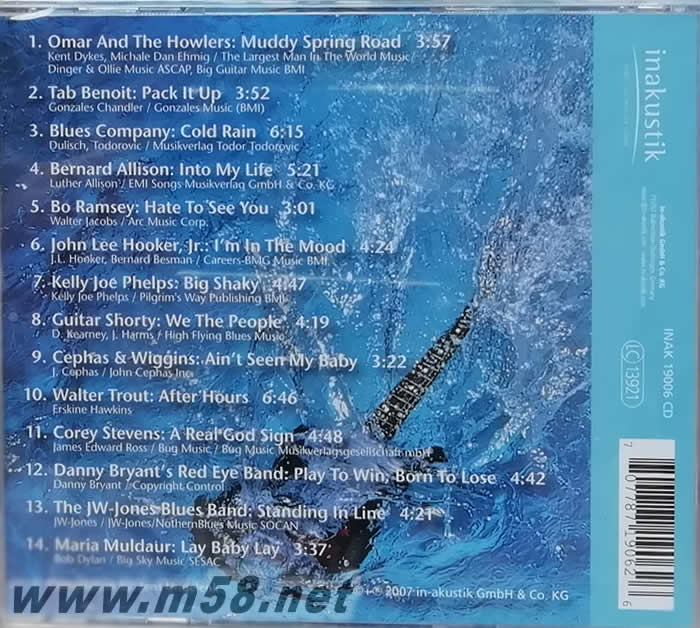 Fresh Blues Vol.6 清新藍(lán)調(diào) 系列第6集(m58.net) 德國著名發(fā)燒廠牌in-akustik除了製作高水平的錄音外,亦代理不少國際著名廠牌如RUF、Telarc、Rounder、Alligator及Crosscut等。此專輯收錄了多位馳名國際的藍(lán)調(diào)天王、天后的經(jīng)典名曲如:[Blues Company”Cold Rain”]、[Tab Benoti”Pack It Up”]、[Bo Ramsey”Hate To See You Go”]、[John Lee Hooker Jr.”I’m In The Mood”]、[Cephas & Wiggins”Ain’t Seen My Baby”]及[Maria Muldaur”Lay Baby Lay”]等,喜歡藍(lán)調(diào)音樂必備之選。