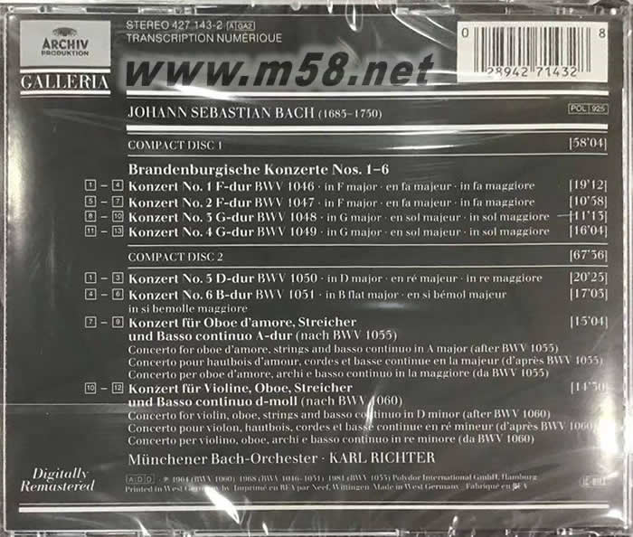 Karl Richter J.S. Bach : Brandenburgische Konzerte Nos. 1-6, Brandenburg Concertos 卡爾 李希特 巴赫:勃蘭登堡協奏曲(m58.net) 瓦格納稱為“一切音樂中最驚人的奇跡”:卡爾·李希特 - 巴赫:勃蘭登堡協奏曲 / Karl Richter - Bach: Brandenburgische Konzerte 雙CD( ARCCD4271432 ) 偉大的德國作曲家J.S.巴赫素以精湛的對位技巧賦予復調音樂無限的魅力,這組《勃蘭登堡協奏曲》(Brandenburgische Konzerte)是他眾多管弦樂作品中最為著名的一組。全曲共6首,每首的樂器組合各不相同。從這組樂曲中我們能體會到巴赫對藝術的感悟能力與杰出的作曲技能。這組樂曲被瓦格納稱為“一切音樂中最驚人的奇跡”。 這張《巴赫:勃蘭登堡協奏曲》錄音是非常著名的,卡爾?李希特(Karl Richter)與他指揮的慕尼黑巴赫樂團堪稱巴赫作品的最佳詮釋組合之一,也被譽為最富有德國氣質的巴赫作品演奏專家。在上個世紀六十年代的這個經典錄音中,正處藝術生涯巔峰時期的李希特為我們展現出正是這樣一種風格的《勃蘭登堡協奏曲》。不過這或許并不是人人喜愛的,在以往舊版的《企鵝唱片指南》中,這張唱片甚至僅僅獲得一星的拙劣評價。事實上,有更多的人鐘情于李希特的這個版本,因此它被評選為《音樂圣經》中《勃蘭登堡協奏曲》的首選版本,在《日本唱片藝術》“名曲300首”中,它則占據了第一名的寶座。李希特的演繹舒緩平穩,而且非完全仿古,但是在精神層面他卻具有與巴赫最為貼近的氣質,而且具有令人屏息的戲劇性與魅力,充滿對現世的否定和對彼岸的向往。這套唱片雖然是60年代的錄音,但是音響效果卻非常出色。