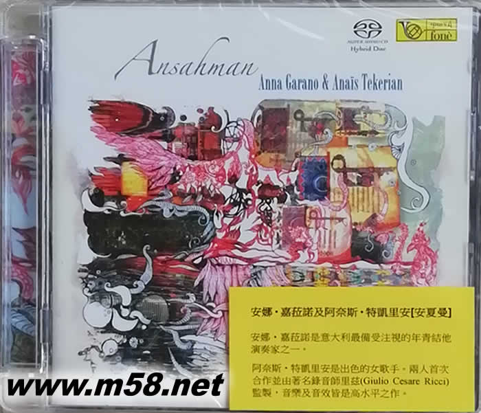 吉他與女聲 安娜‧嘉菈諾及阿奈斯 特凱里安[安夏曼]Anna Garano & Anais Tekerian[Anshaman] SACD(m58.net) 安娜‧嘉菈諾 (結他) 阿奈斯‧特凱里安 (主音) 基蘭‧阿齊梅 (單簧管) 1. 安娜‧嘉菈諾是意大利最備受注視的年青結他演奏家之一。 2. 阿奈斯‧特凱里安是出色的女歌手。 3. 兩人首次合作並由著名錄音師里茲Giulio Cesare Ricci)監製,音樂及音效皆是高水平之作。
